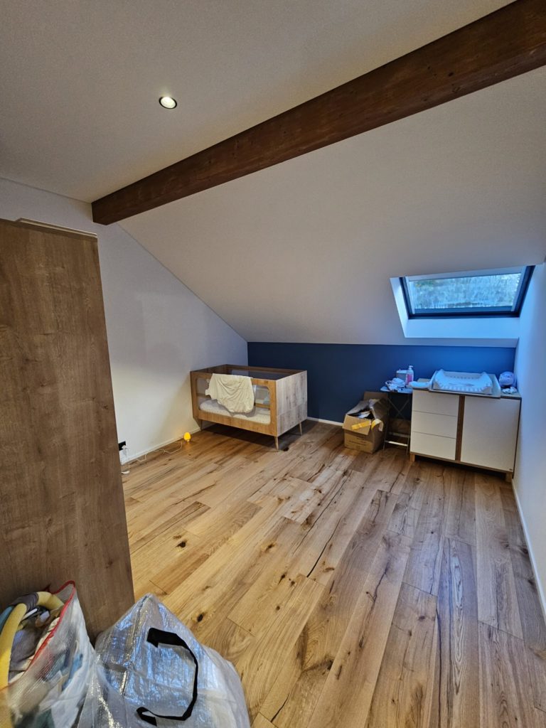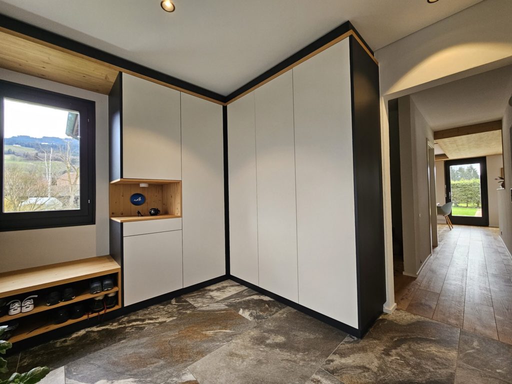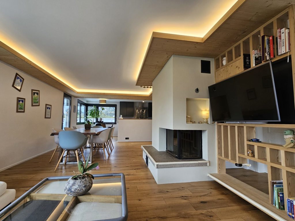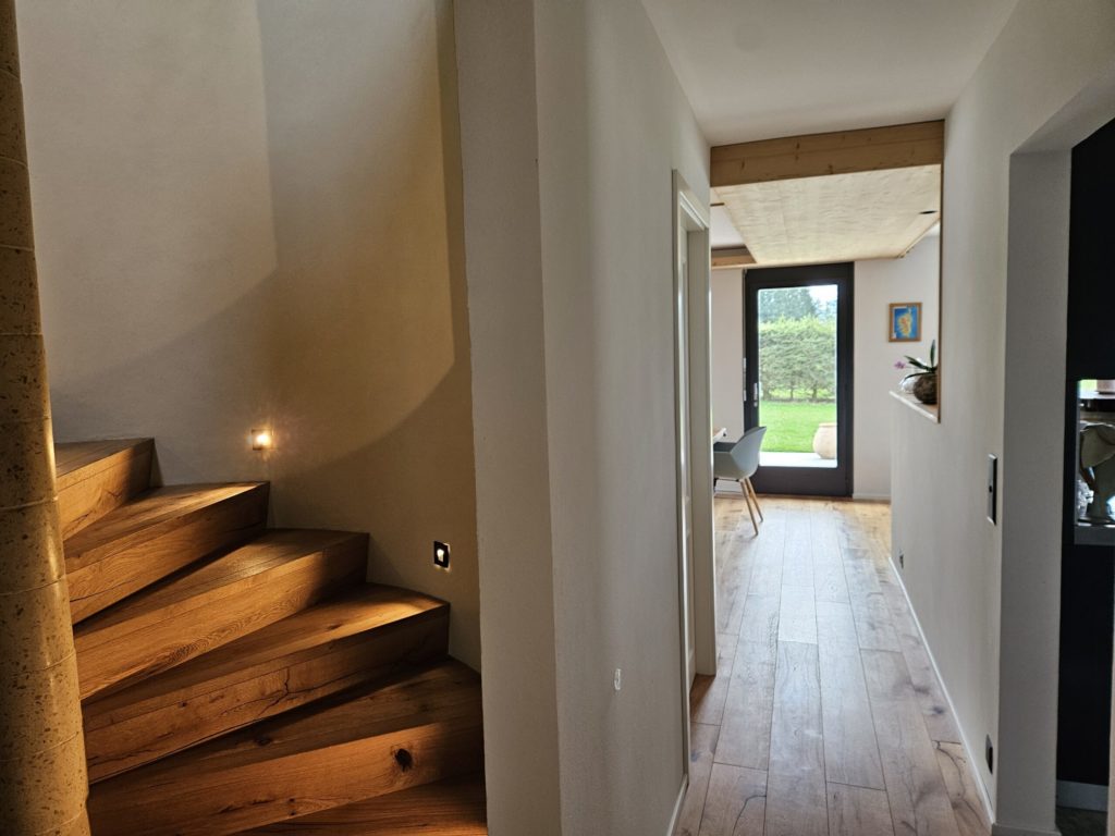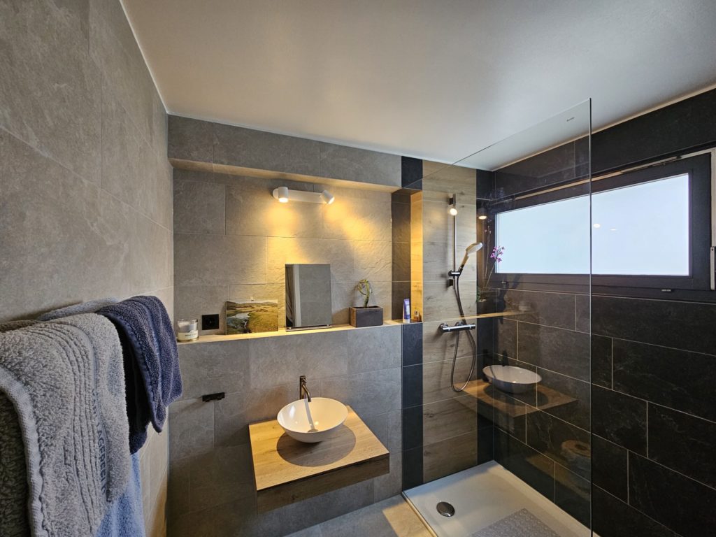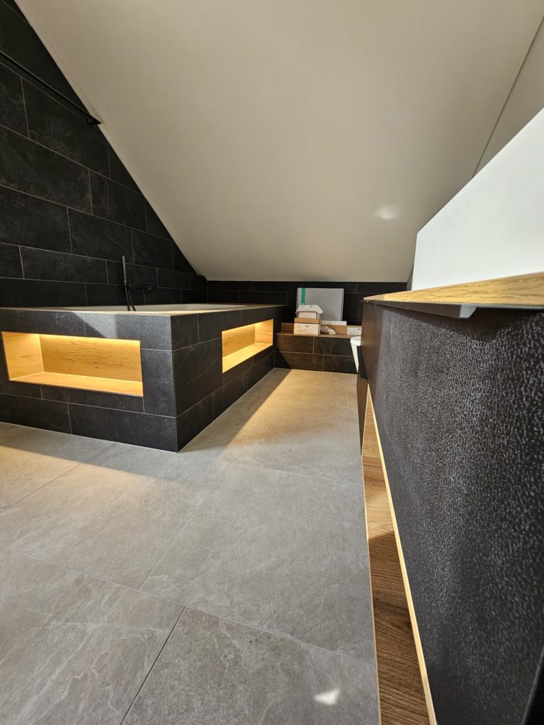 Le bois ainsi que le revêtement de sol en grès cérame de style ardoise s’intègrent dans une volonté des propriétaires de rendre les espaces chaleureux. Les matériaux utilisés ne sont pas sans rappeler une ambiance et une atmosphère alpine tout en restant dans la sobriété.